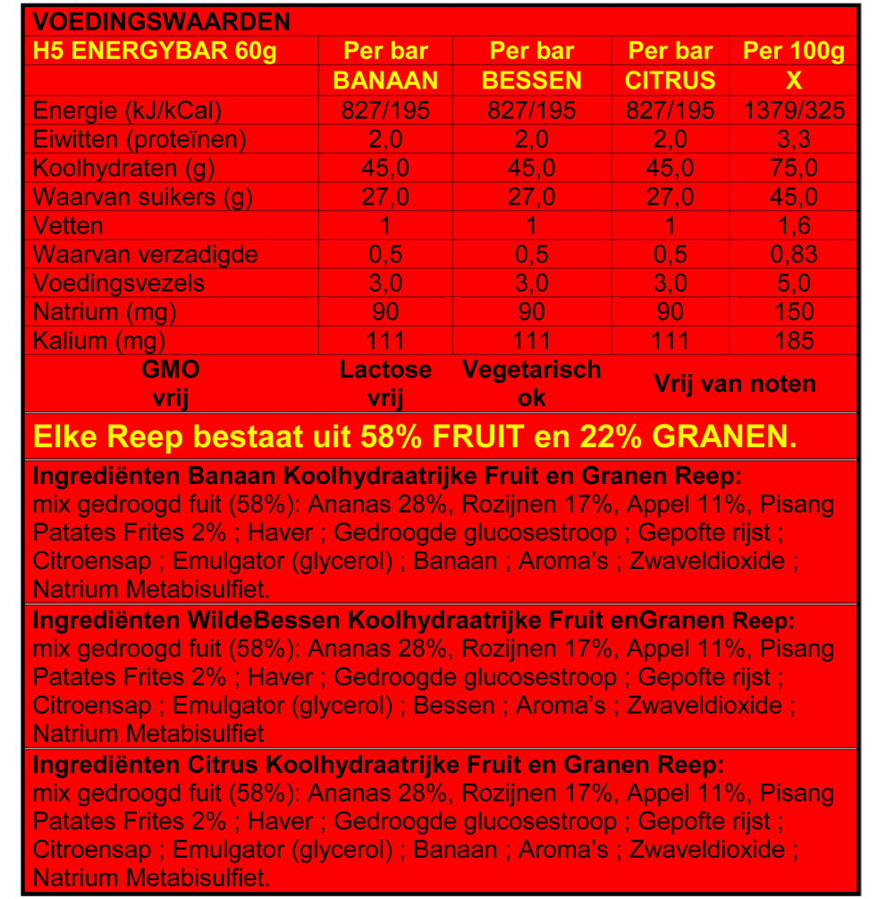 HIGH5 Energy Bar is een super wedstrijd- en trainingsreep vol energie. Laag in vetgehalte (minder dan 2%) en boordevol snel absorbeerbare koolhydraten die uw maag en darmen niet extra belasten. Ze bestaan uit een complete en volwaardige voeding en smaken fantastisch. De repen bestaan voor 58% uit vers fruit en voor 22% uit vezels.
