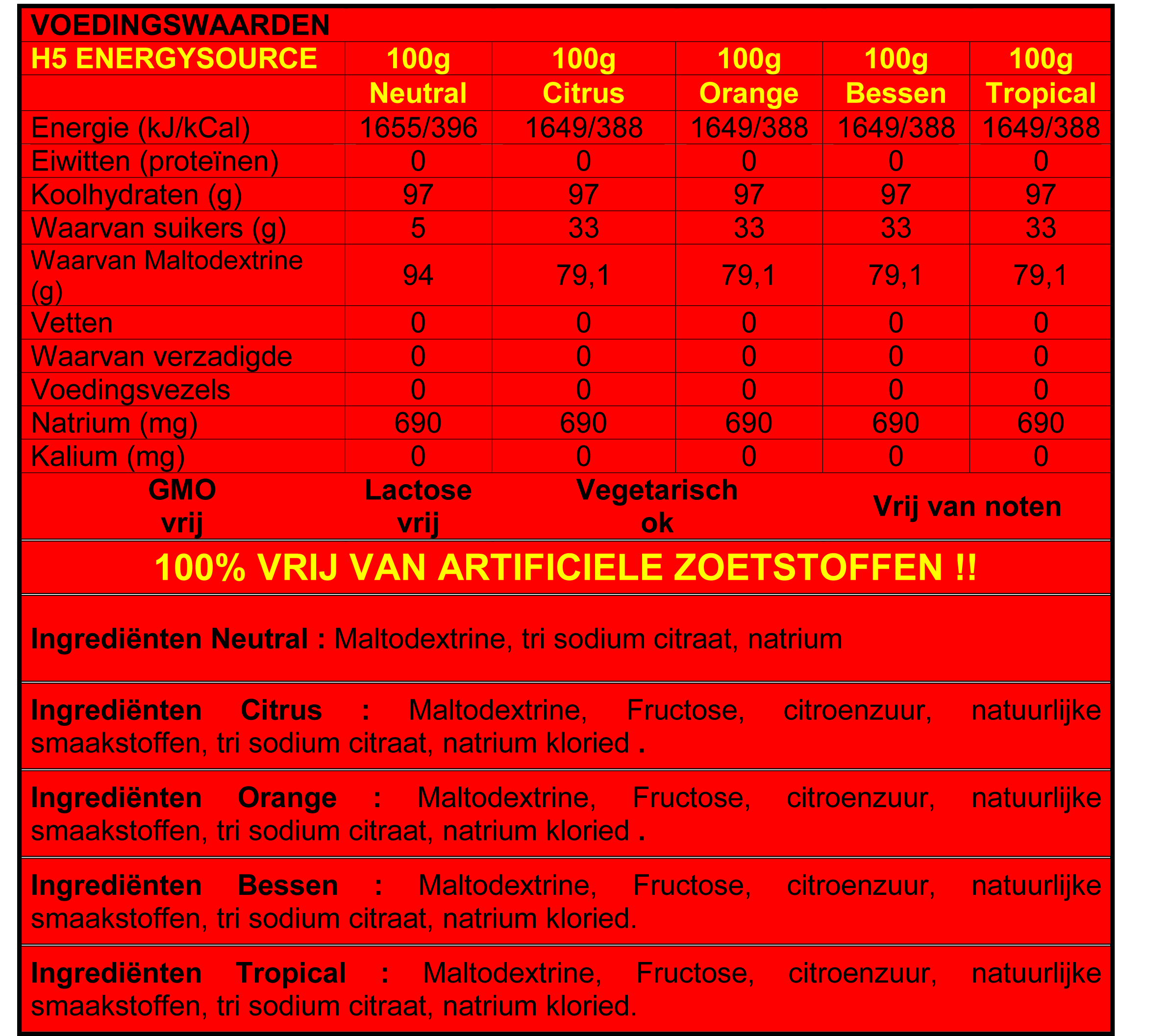 Maltodextrine, fructose (32%), citroenzuur, natuurlijke smaakstoffen, trisodiumcitraat, natriumchloride (0,3%)